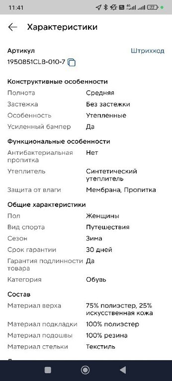 Дутики очень хлипкие, порвались после недели использования! Не советую категорически!В характеристиках написано зима, но по факту в снег носить их нельзя. Оценка одна звезда.