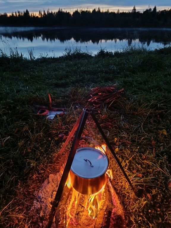 От үстіне қазан асуға арналған болат үшаяқ. Жайылған күйіндегі биіктігі – 75 см. Ілгегі бар шынжыр жиынтыққа кіреді.