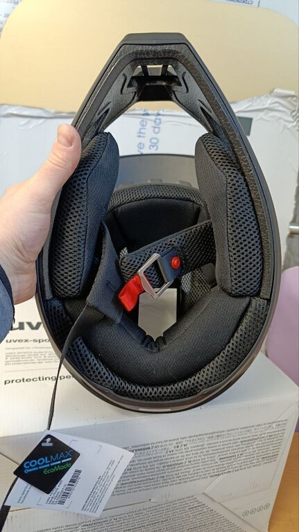 Ранее использовал два бюджетных велошлема другого бренда, у них подкладка из пенопласта с редкими поролоновыми вставками - на голове очень жестко сидят. Еще есть полноценный кроссовый шлем - у него все в порядке с подкладками, но вес 1450 гр., шея устает. У Uvex Ravage реальный вес - 700 грамм - просто пушок. Подкладки все мягонькие: и сбоку, и сверху, как в кроссовом шлеме, а при этом очень легкий. Достаточно отверстий - будет дышать летом. Размер М 56-59 при моей окружности головы 57-58 см. налазит очень плотно, даже туго. Но, думаю, разносится чуток.