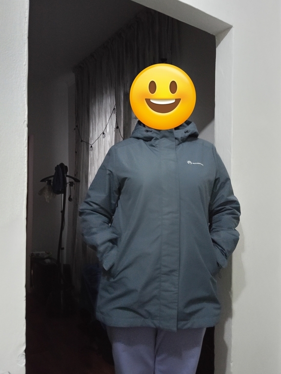 Любимая куртка, удобно накинула и пошла. Не промокает.