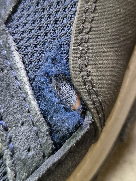 На месте изгиба с жёстким материалом носка ткань рвется из-за давления жёсткого материала