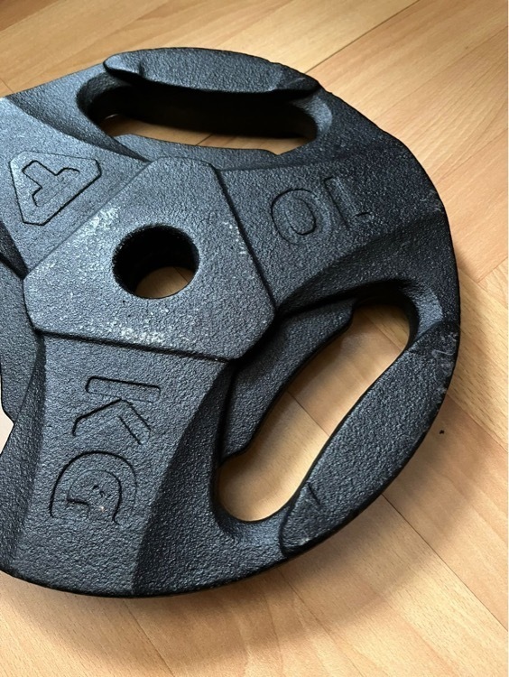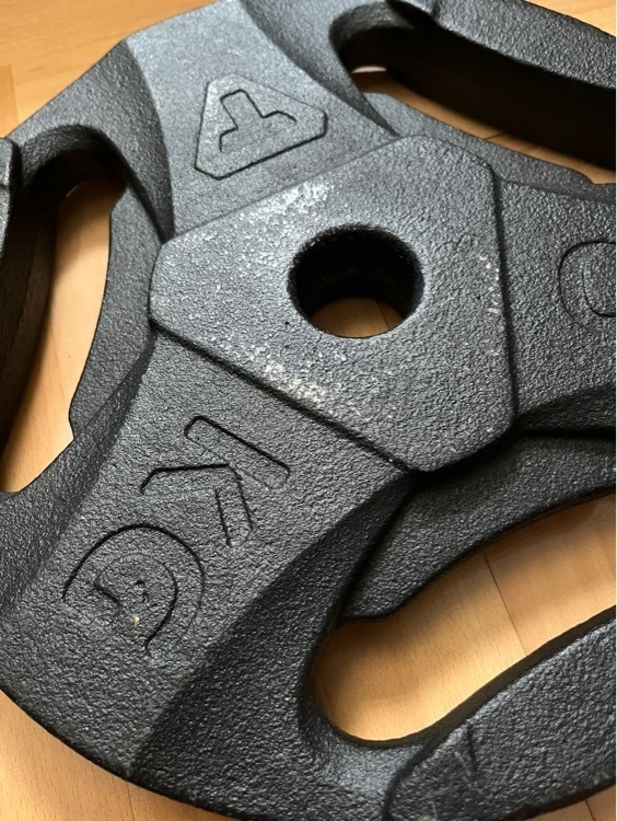 Круглый, с дырками для рук, черный, тяжелый, можно использовать как гантели в различных упражнениях