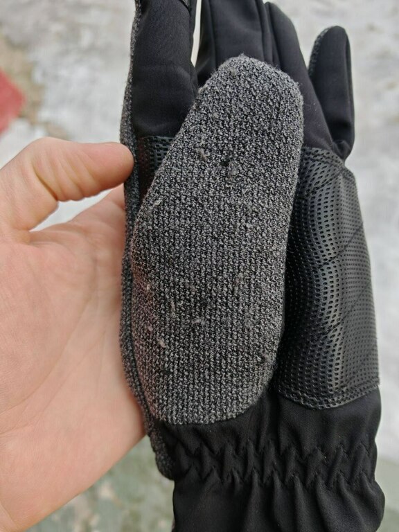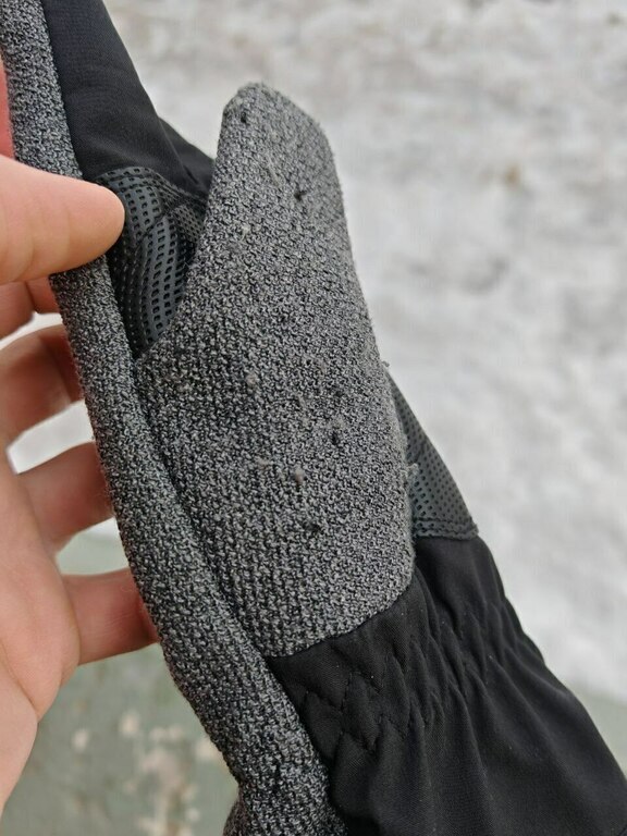 2. Внешнее покрытие - это фиаско. Симпатичное на вид, но очень непрактичное. Если у вас есть одежда или обувь с липучкой - после первого же контакта с ней перчатки сразу все будут в зацепках, внешний вид будет утрачен безвозвратно и носить их будет невозможно, смотрите фото (один раз коснулся велкро на куртке).