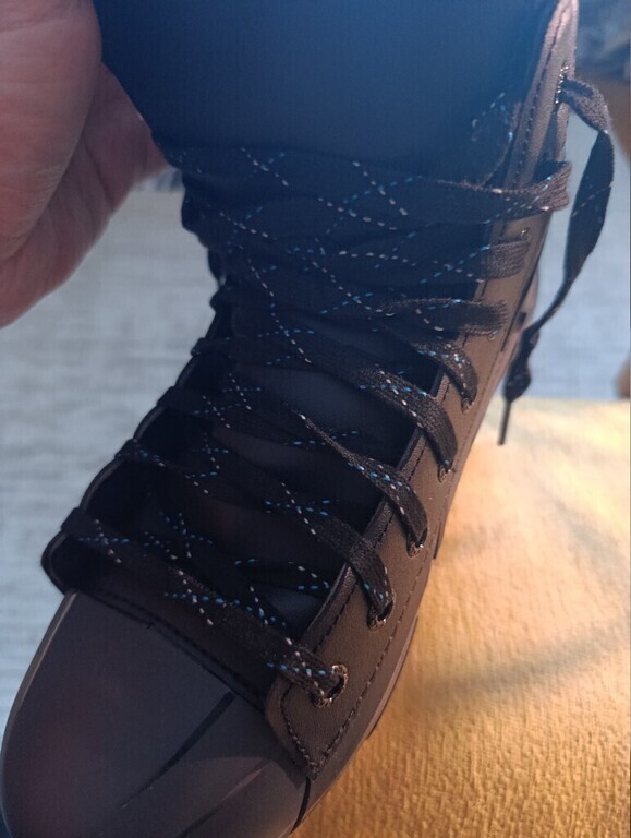 У меня размер ноги 41. 42-й размер коньков мне оказался маловат. Взял 43-й размер, подошли. Поэтому лучше их мерить. И шнурки тонкие, это верно.
