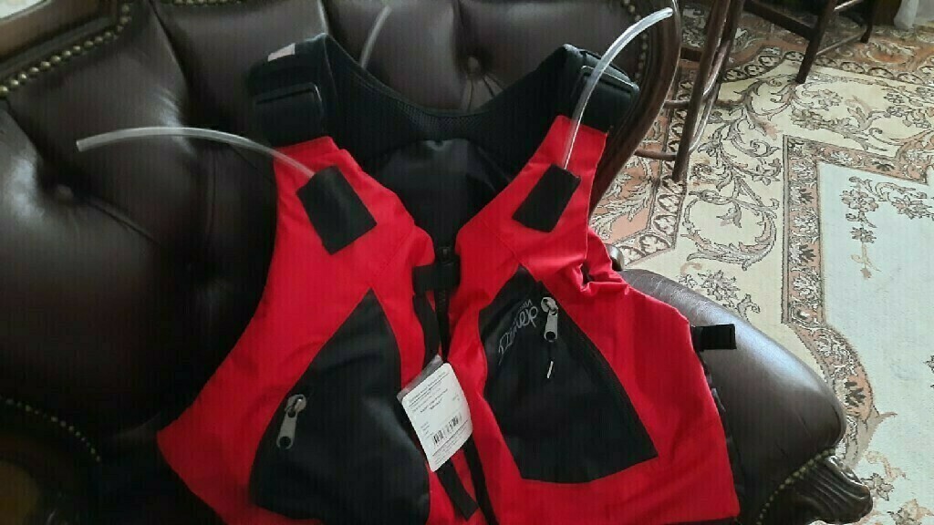Яркий, качественный жилет. Молния хорошо работает, заглушки плотные, есть отверстия, привяжу к жилету), надувается очень легко и быстро.Движений не сковывает.