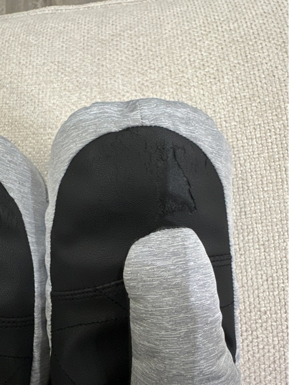Варежки ни разу не использовались, были куплены и лежали в шкафу. При внимательном изучении были обнаружены трещины на внутренней стороне.