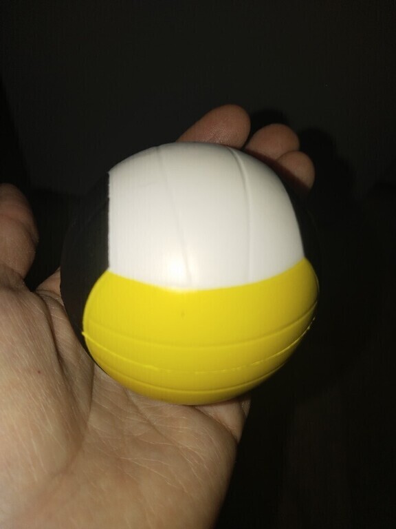 Упругий, компактный, в меру мягкий. Качество исполнения прекрасное. Краска нестираемая, износостойкая. Приобретал для использования в качестве эспандера для внучка. Внук доволен. Рекомендую к покупке.
