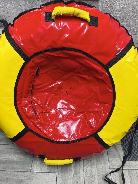 Дно тюбинга изготовлено из высокопрочной армированной ткани, которая гарантирует долгий срок службы и обеспечивает отличное скольжение. Материал устойчив к морозам и выдерживает температуру -25–28 °C. Все швы усилены капроновой лентой. - КОМФОРТ ИСПОЛЬЗОВАНИЯ