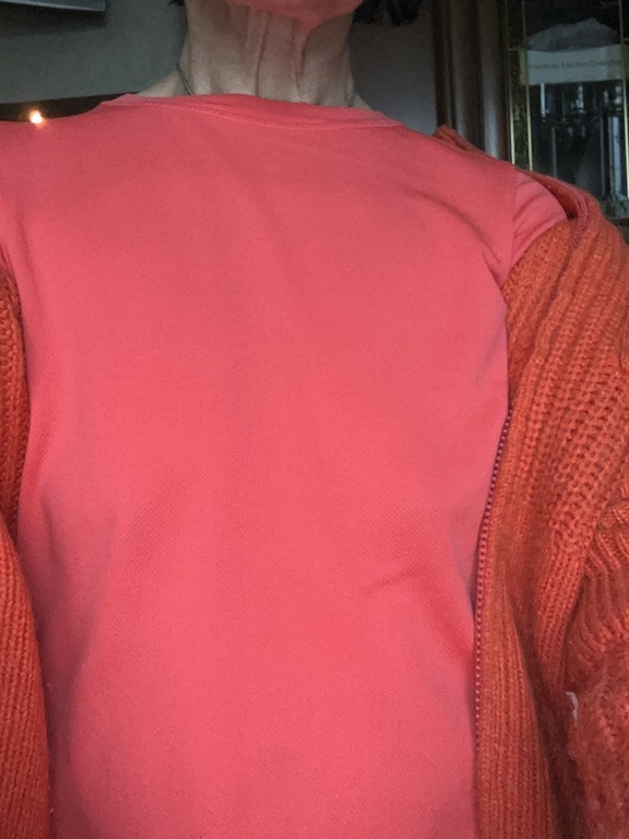 Приятная кофточка, цвет ближе к морковному, не вызывающий, хорошо греет, тело не раздражает, мне понравилась