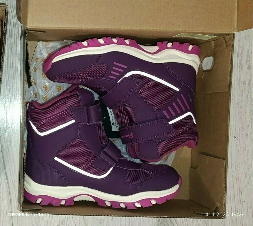 В восторге ребёнок и мама,качественно сделанная обувь, отличная фиксации ноги,полная защита ног,соотношение цены и качества, внешний вид,устойчивая подошва:на льду,в горах,так и в городской зоне.