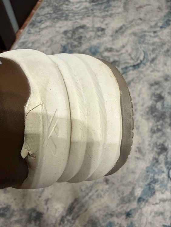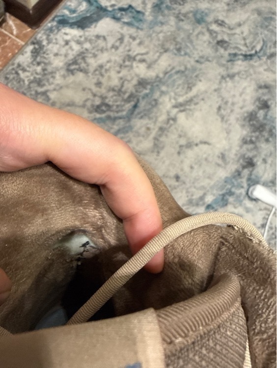 Разорвалась подкладка, т.к. сшита на пятке Т-образным швом и, соответственно, при снятии он натягивается и разорвался и пена в одном месте оторвалась.