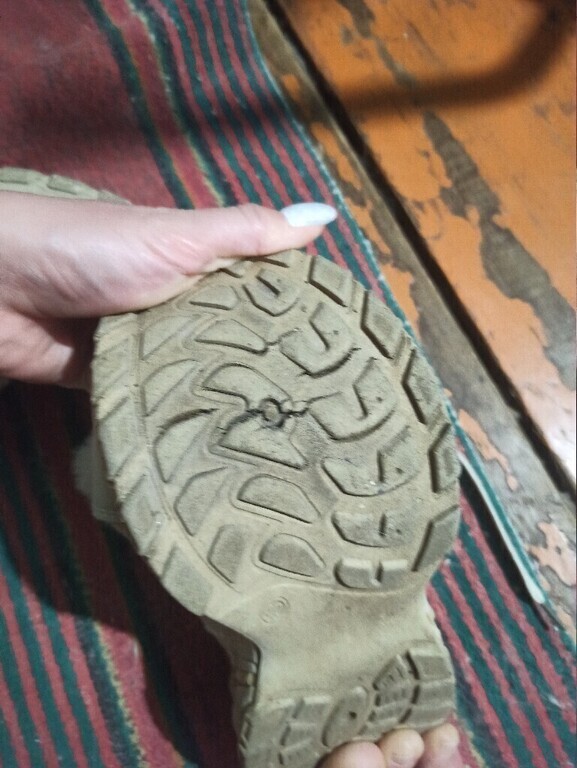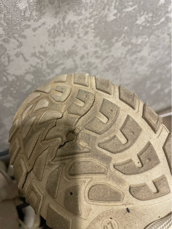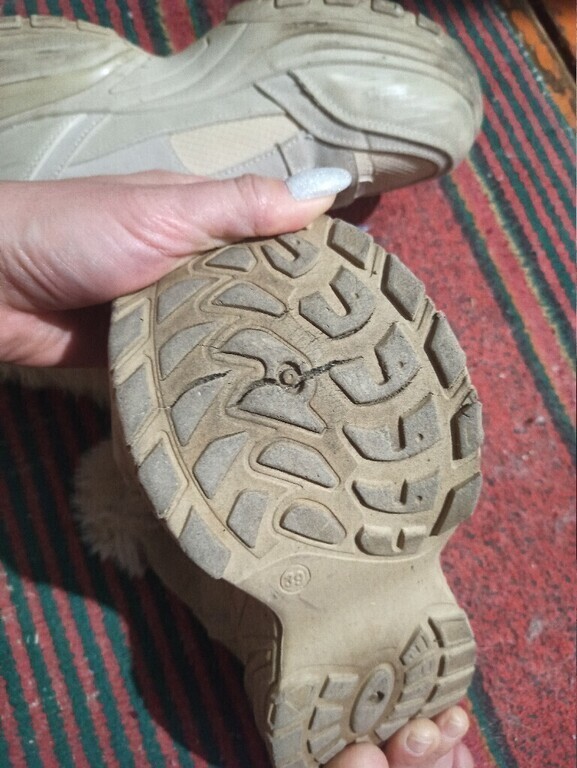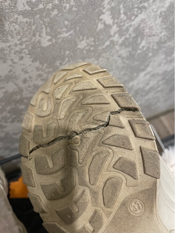 Треснула подошва на обоих ботинках. Брала 2 пары, себе и дочери, и обе треснули. Буду оформлять возврат. На фото видно, что разные размеры, оба левых ботинка.