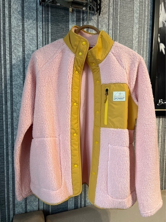 Классная, легкая и яркая куртка. Теплая. Это именно куртка, не кофта, у нее более плотный ворот и кнопки. Выглядит стильно, качество пошива хорошее.