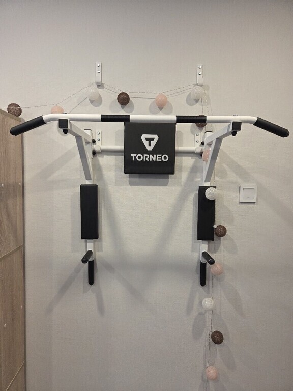 Универсальный тренажер Torneo 3 в 1 предназначен для тренировок с собственным весом. Модель можно использовать 3 способами: как турник с широким и прямым хватом, как брусья и как тренажер для пресса (поднятие ног). Благодаря особенностям крепления турник можно снять и перевернуть прямо во время тренировки. На рукоятках расположены резиновые накладки, которые обеспечивают надежный хват. Предусмотрена мягкая подушка для выполнения упражнений на пресс. Турник надежно крепится на стену, крюки для установки идут в комплекте. Болты и дюбеля в комплект не входят.