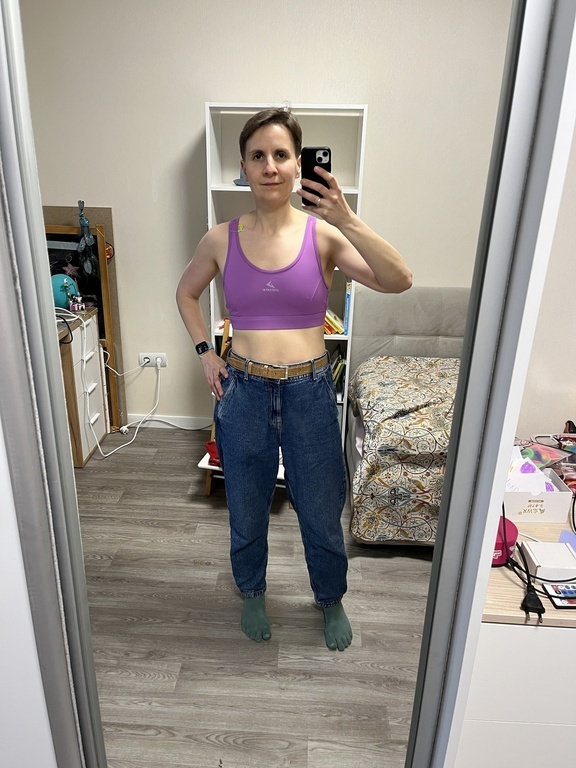 Любимый топ. Очень удобно сидит на маленькой груди. В сиреневом занимаюсь силовыми, в черном таком же бегаю.