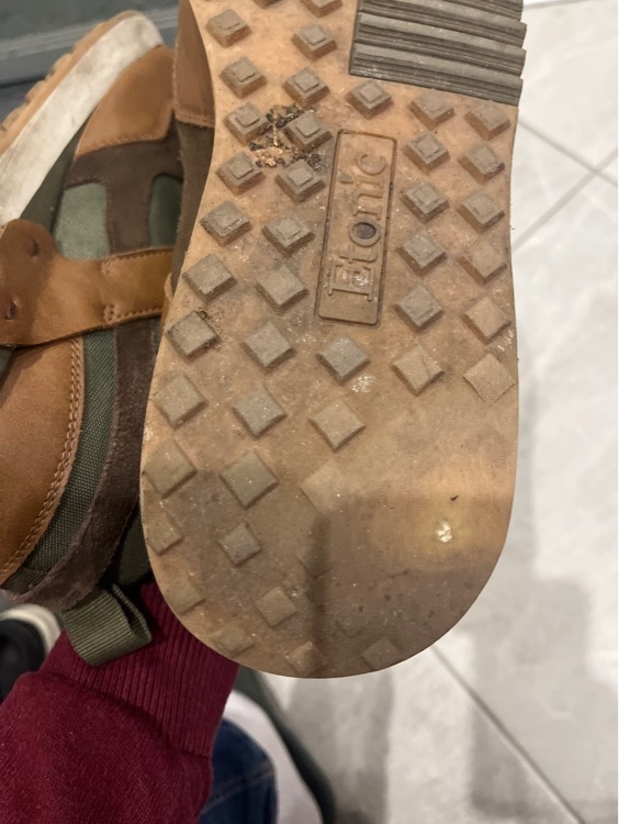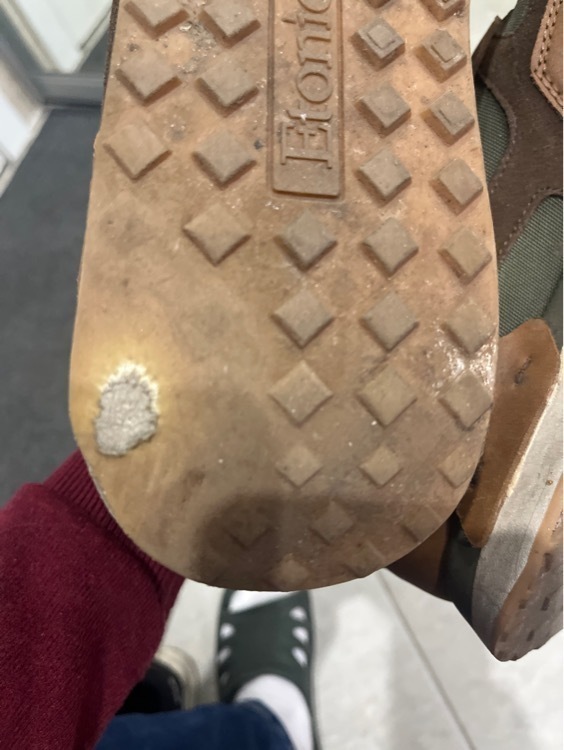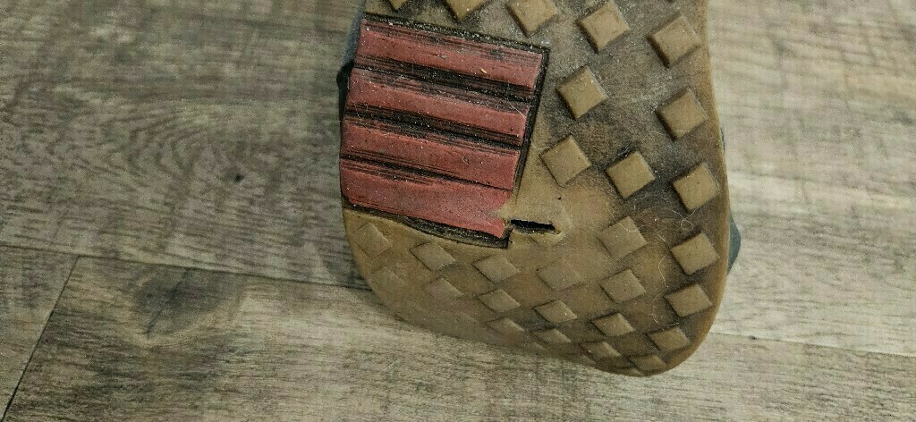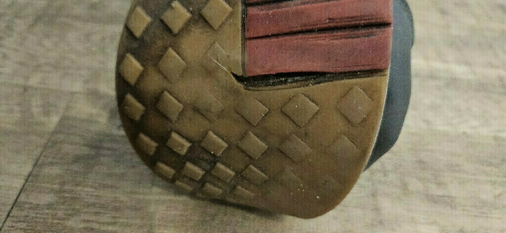 На правом вылетает при ходьбе пятка. В области левой пятки криво приклеена подошва.