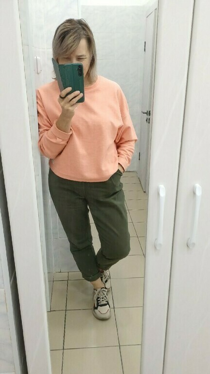 Купила костюмом с шортами, мягкий хлопок, как раз сейчас и на осень теплую можно носить. Немного большевато, хотя наверное так задумано, по типу оверсайз