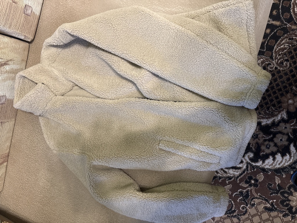 Выглядит как мини шуба, мягкая и уютная для ношения. Очень теплый.