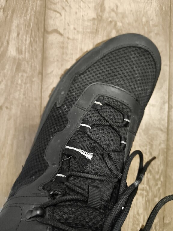 Шнурки скользкие, развязываются. Зато хорошо стягивают нижнюю часть ботинка. При высокой активности потеет нога. Вроде как маркий материал, но мне нравится, хожу уже два месяца, ещё ничего не поцарапал, не испачкал.