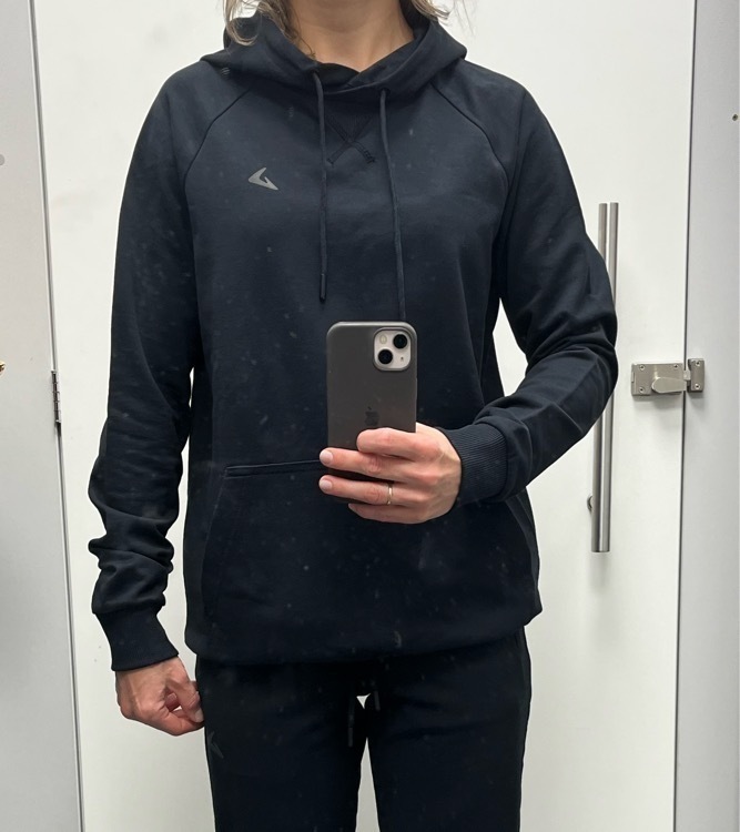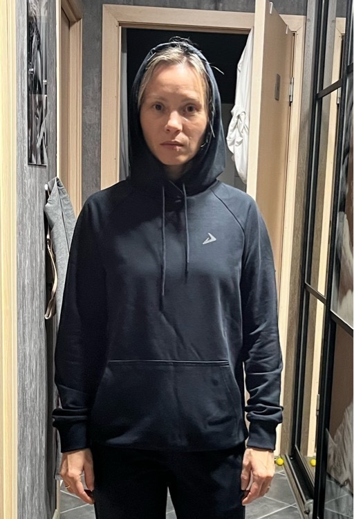 Хорошее худи. Ткань очень приятная к телу. Я довольна покупкой. У меня уже есть такое же, только другого цвета, ношу его много лет. На мои параметры – обхват груди 102 см и обхват бедер 110 см – 50-й размер сел как 48-й, я так и планировала, чтобы плотно прилегало по фигуре.