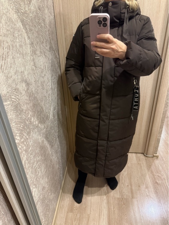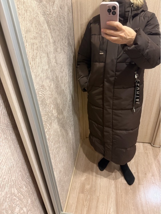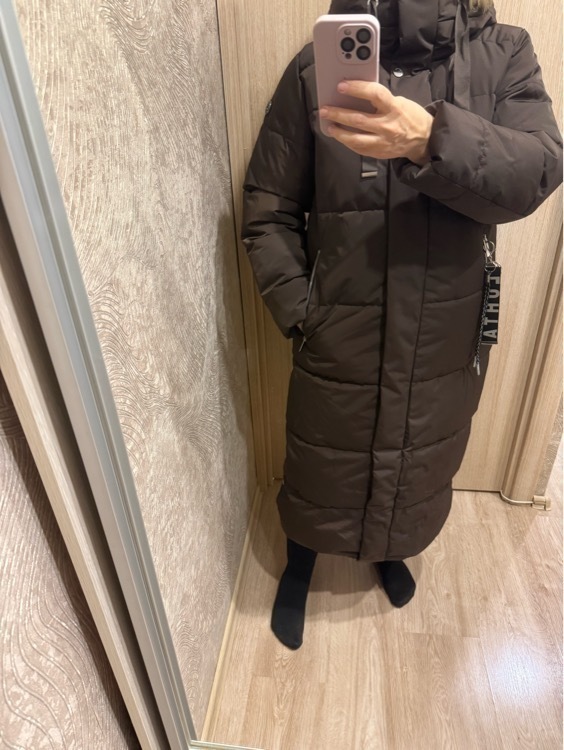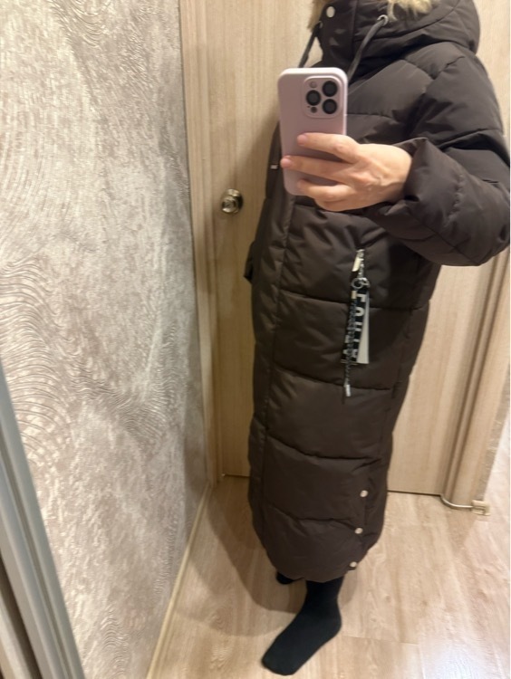 Хороший пуховик, цвет как на картинке, шоколадный, темно-коричневый. Очень теплый, пока мерила, вспотела. Легкий, длина 118, комфортный. Ткань хорошая, утеплитель по всей длине равномерный, качественный пошив. Проверила через "Честный знак", все нормально. Удобно, есть кнопки по бокам, можно расстегивать внизу. Глубокие карманы, хороший капюшон, высокий воротник, продувать точно не будет. На кнопках указана фирма, рекомендую.