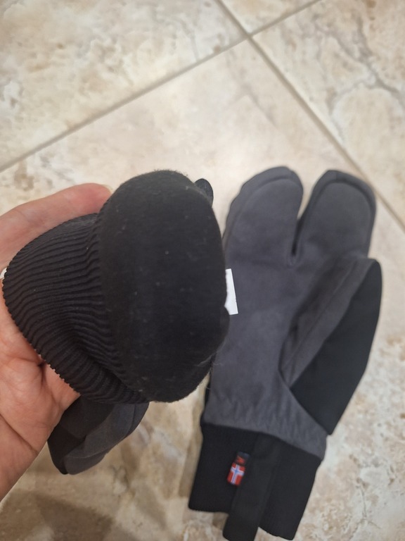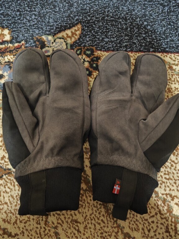 Варежки с ровными и аккуратными швами (видно на видео), сделаны из хороших материалов – плотных, не мнутся, материал похож на замшу, но без сильной бархатистости. Внутри мягкий флис. Варежки точно теплые, хорошо защитят от ветра. Двухпалые – вполне удобно, смотрятся интересно. На обхват руки 20 см размер S сел отлично, а M оказался немного великоват по длине ладони и пальцев. Рисунок (надпись) на внешней стороне белого цвета, не светится в темноте.