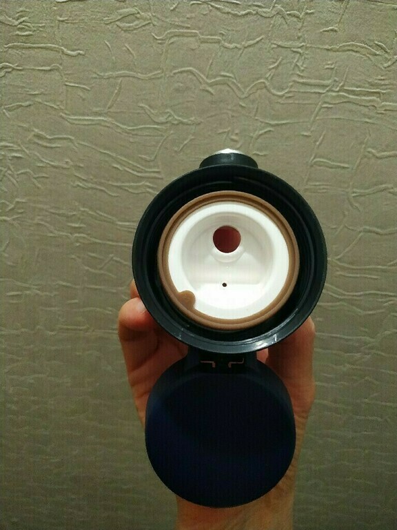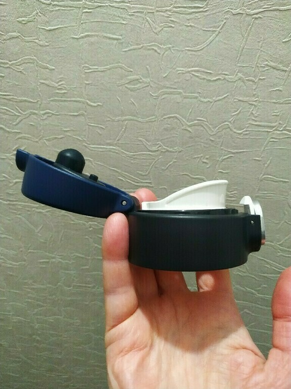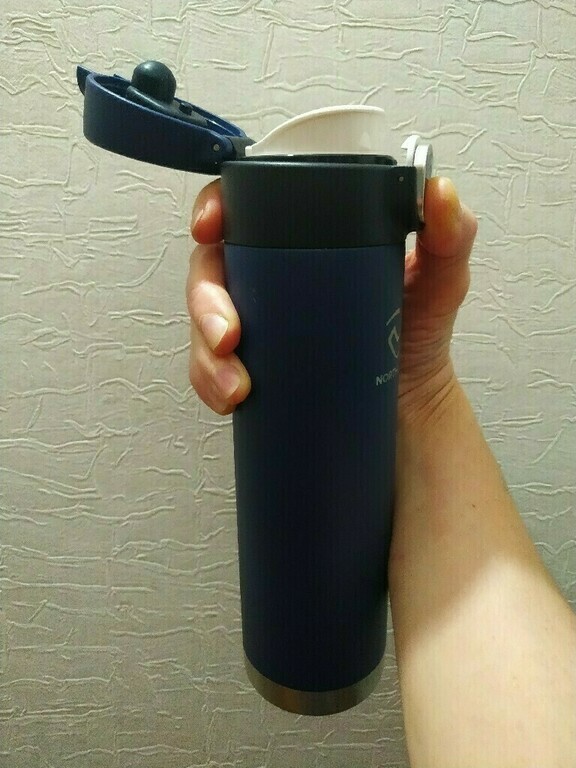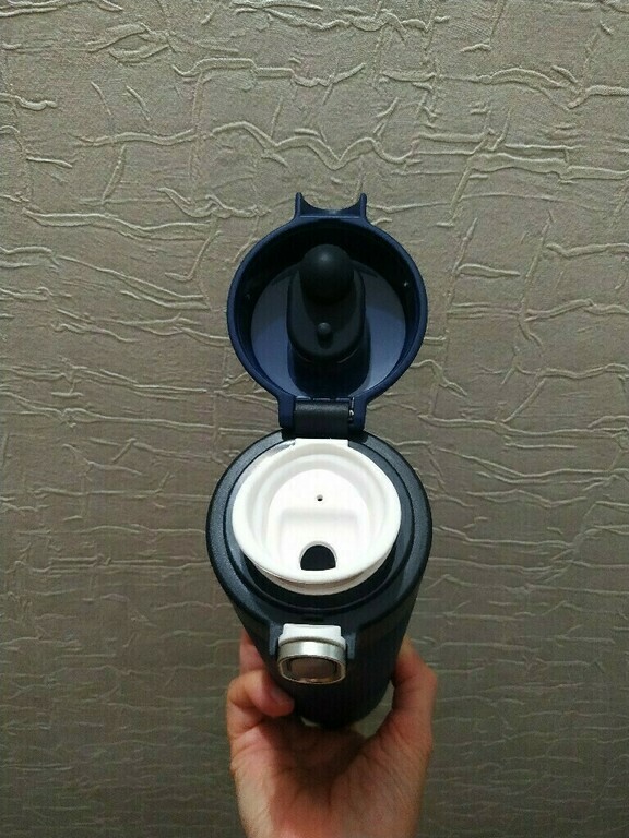 Очень удобная с кнопочкой, одной рукой, когда другая занята, при лёгком надавливании на неё, крышка открывается и можно уже пить.